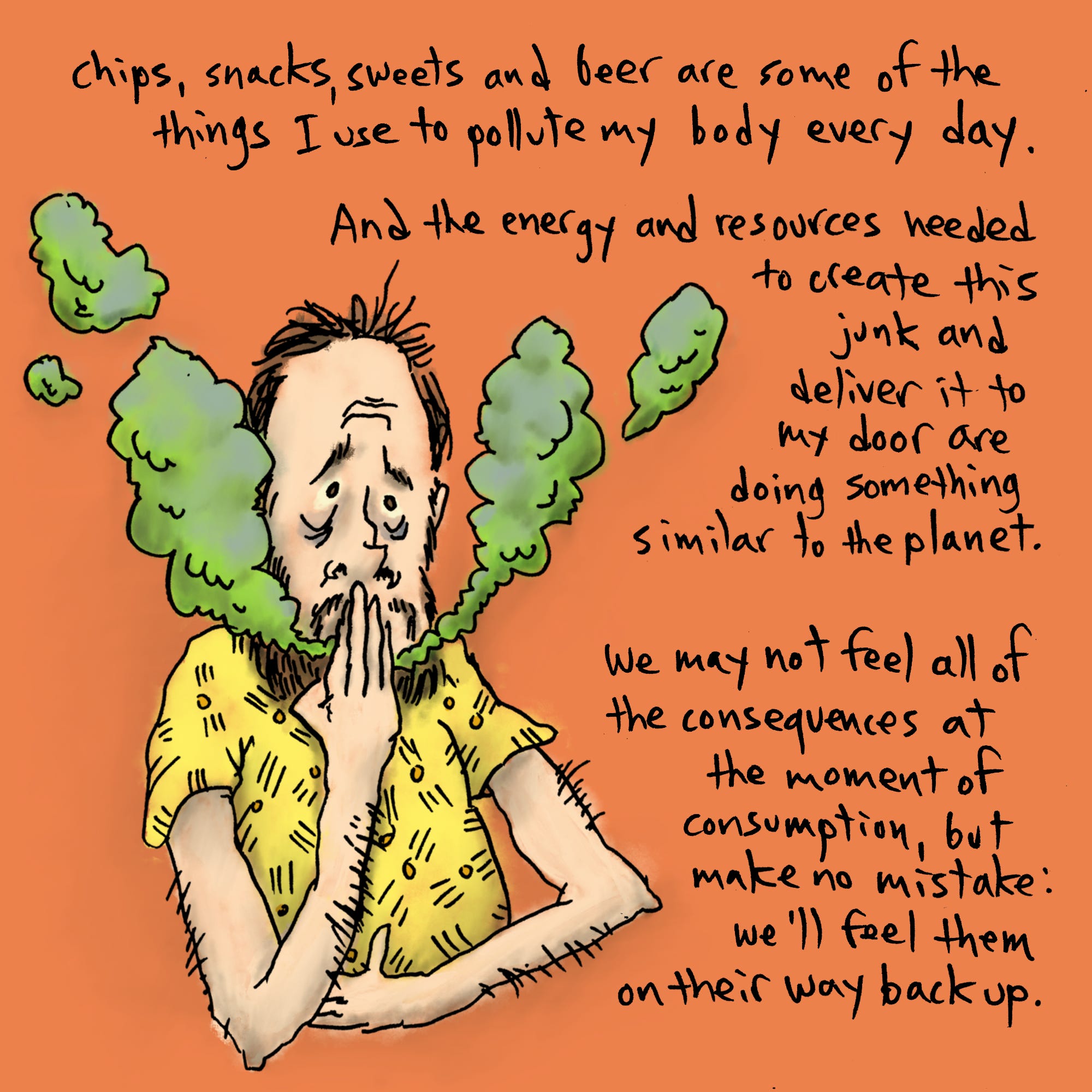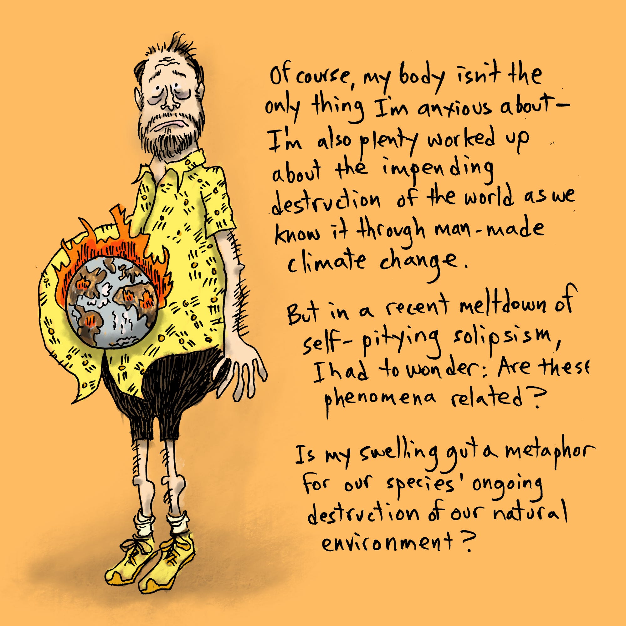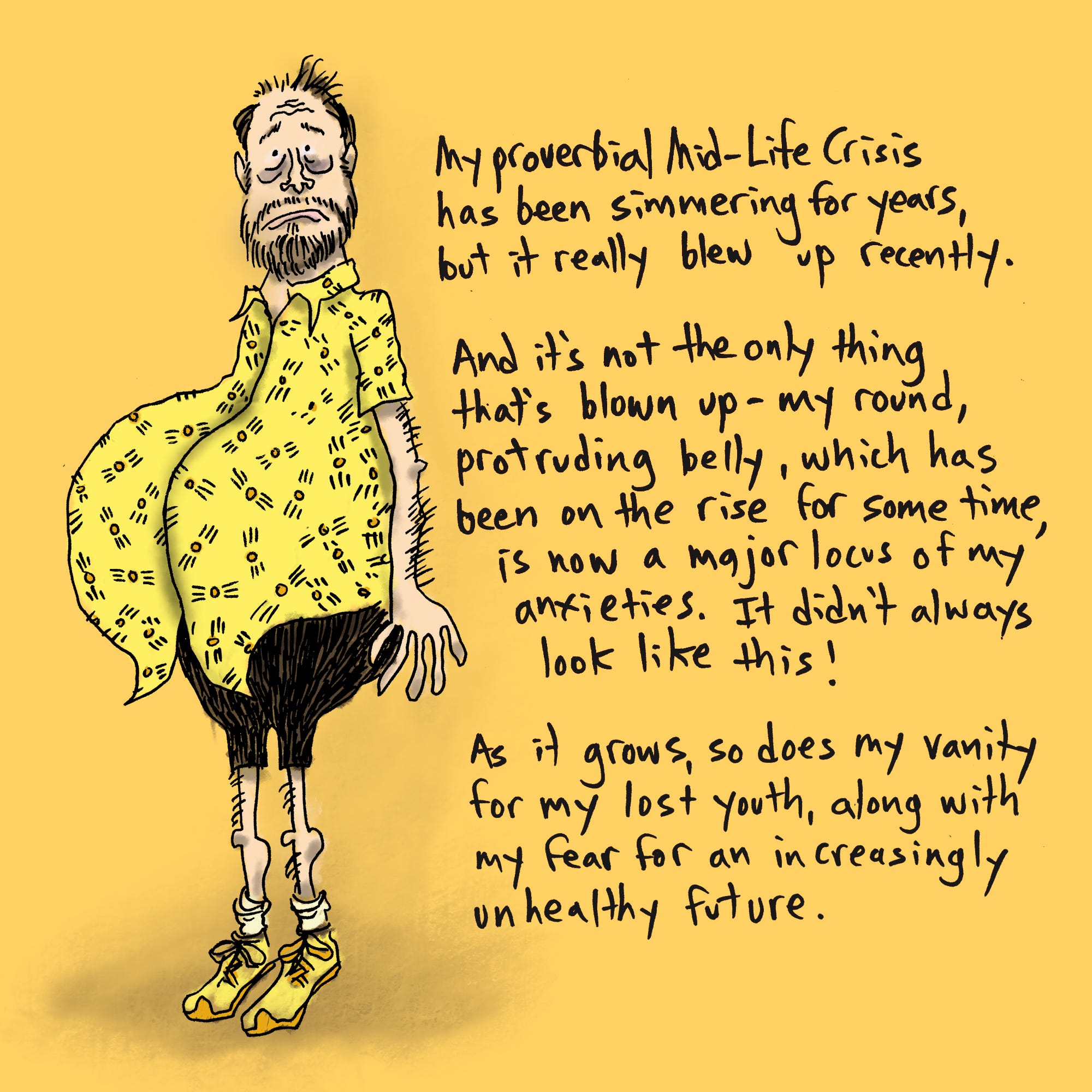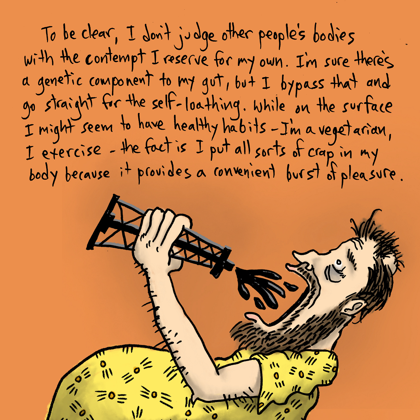 I exercise much more since I first posted this and, well, I’m more CONSCIOUS of my eating, which isn’t the same thing as changing my diet, but hey. The gut endures, and, unless I make extreme and unpleasant life changes, will likely continue to do so for the duration. Nowadays I might be 0.001% more accepting of it, which I suppose is a thing of some sort.